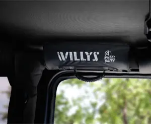 - Description: One Side Window Visor for driver or passenger side. Velcro attachment to Sport Bar, flips up out of the way when not needed. Designed to function with optional Grab Handle. Black with Willys and 4 Wheel Drive logos